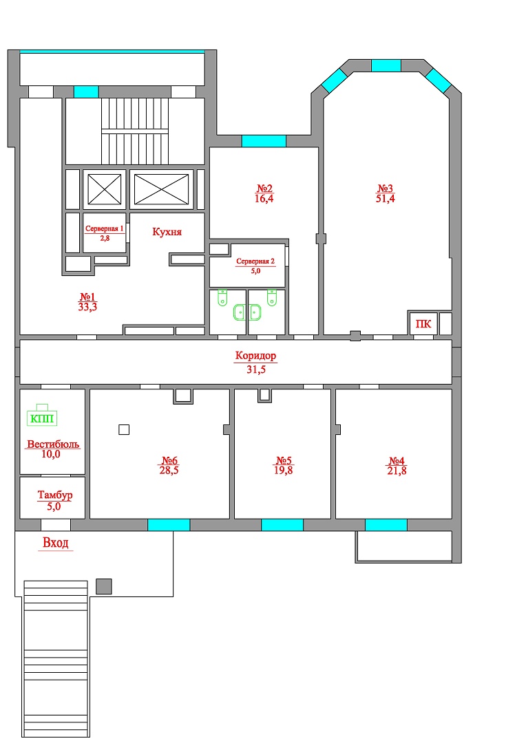 1 главный вход, 1 запасной выход, 5 кабинетов, 2 с/у, кухня, 2 серверные, остекленный балкон, кондиционеры во всех помещениях, высота потолка 3,0 м., электрическая мощность 25 кВт., все коммуникации.